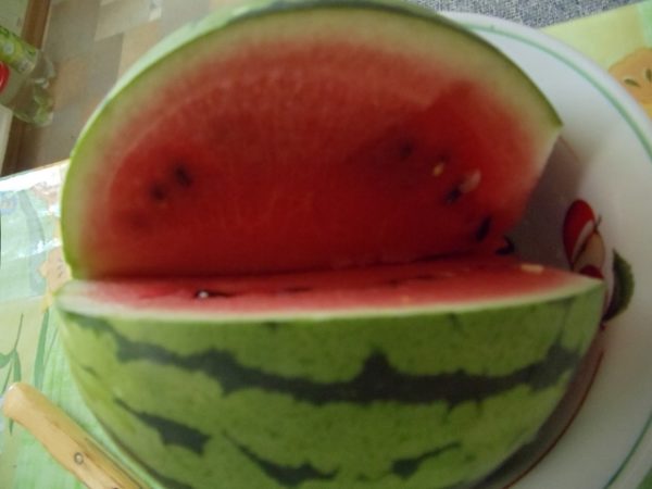 The fruit ripens in 75-85 days with an average weight of 10-11 kg. The plant does not have a high yield, but fruits steadily. The bright red pulp of the berry is juicy and crunchy with a characteristic watermelon sweetness. The peel has a striped color, the thickness is small. The variety is immune to disease and moisture. The harvest is well preserved and transported.