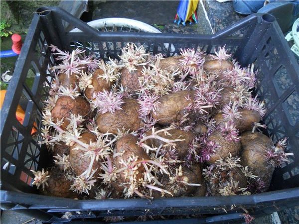 Papas debe ser almacenado en el sótano en recipientes de plástico. Antes de plantar un par de días debe obtener y clasificar la fruta. Elija papas germinadas de tamaño mediano, entonces será más fácil que germinen en el suelo.
