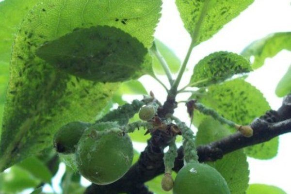 - Pulgón de ciruela - el crecimiento de las plantas disminuye, casi no se forman cogollos frutales, todo el follaje se desvanece. Para deshacerse de este proceso de ciruela de insectos de la siguiente manera: