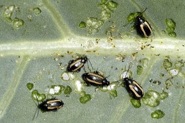 - Pulce crociforme I punti neri sono massicciamente formati sulla pianta, che distruggono le giovani piantine con grande velocità.