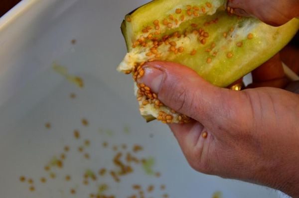 Nella loro struttura, i semi di melanzana sono simili ai peperoni. Non hanno acume, ma c'è un gusto amaro. Per liberarsi di questo svantaggio, il frutto deve essere tagliato in due lunghezze e con un cucchiaino per raccogliere i semi. Questa tecnica è molto buona se stai per cucinare le barche di melanzane ripiene.