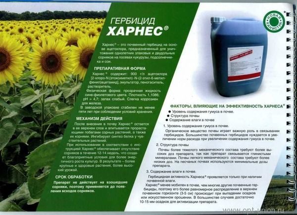- Harnes. Mezzi di contatto Distrugge le infestanti annuali. È portato alle riprese. Consumo 3 l per 1 ha;