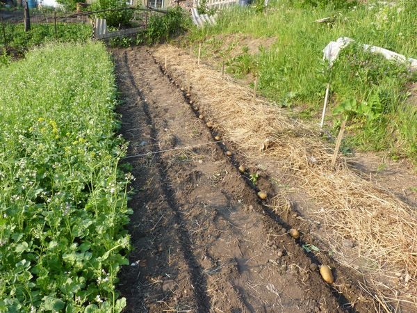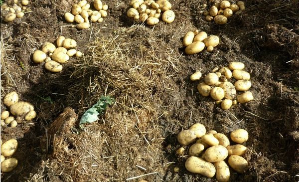 Nell'area designata per le patate si formano pozzi (8 cm). Il gradino è di 30 cm, la distanza tra le file è di 60 cm. Le patate sono disposte in esse, cosparse di terra e l'intera area è coperta da uno strato di paglia (25 cm).