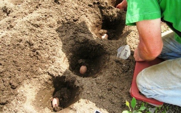 Inoltre, se il terreno è leggero, fai dei buchi o delle scanalature. Una manciata di cenere è versata in ogni pozzo, un tubero è posto, sepolto. I fori sono scavati, facendo uno spazio tra loro di 35 cm, e tra le file - 70 cm.