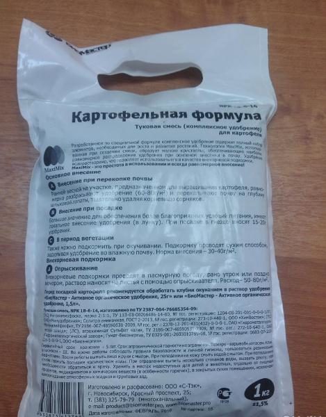 Formula di patate Disponibile in sacchetti bianchi piccoli di uno, due e mezzo o cinque chilogrammi. La preparazione contiene minerali come il fosforo, l'azoto e il potassio. Disponibile sotto forma di granuli. Questo ti permette di fare il farmaco in una forma secca e diluirlo con acqua. Questo fatto dovrebbe essere notato: grazie a lui, il campo di applicazione del fertilizzante è notevolmente ampliato.