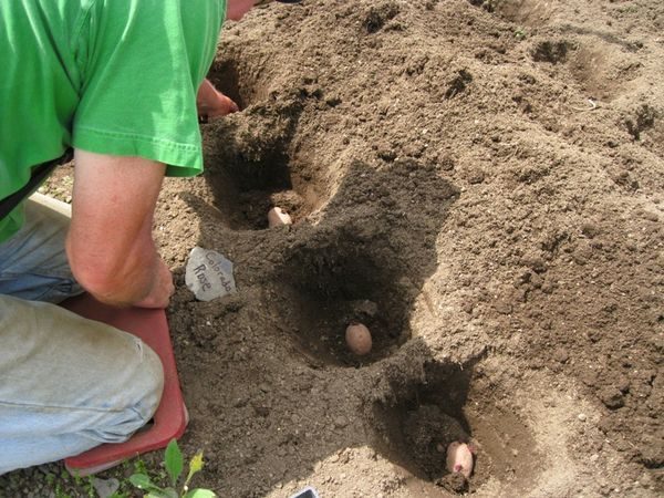 - Atterraggio sotto il buco. In autunno si consiglia di preparare una trama: concimare, pacciamare il terreno. In primavera, i tuberi vengono piantati scavando buchi. I tuberi germinati vengono inseriti nel foro a una profondità di 8-10 cm. Si consiglia di concimare la parte superiore con letame e cenere.