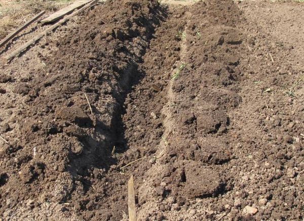 - Atterraggio sotto la trincea. Adatto per terreni sabbiosi. In autunno, le trincee dovrebbero essere scavate 30: 100 cm, uno strato di fieno dovrebbe essere disposto in una fossa di 15 cm e fertilizzato con letame misto a cenere. Durante il periodo di gelo, lo strato viene compattato. In primavera, il materiale di semina viene deposto in una fossa e leggermente cosparso di terra.