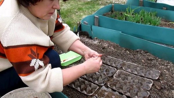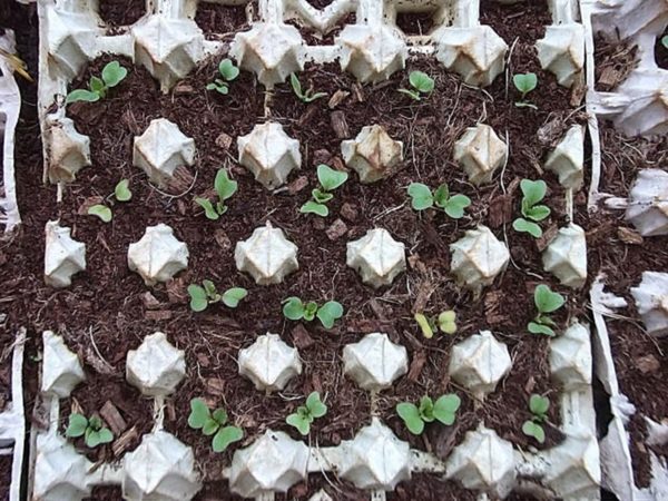 Un'altra opzione che elimina la necessità di diserbo. Le celle di cottura delle uova dovrebbero essere in inverno. Il cartone da cui sono fatti dovrebbe essere sciolto, immergere bene con acqua. Questo è importante - le radici devono essere in grado di germogliare attraverso il materiale di cartone. Nel caso in cui il cartone sia abbastanza spesso, puoi creare dei fondi in ogni cella.