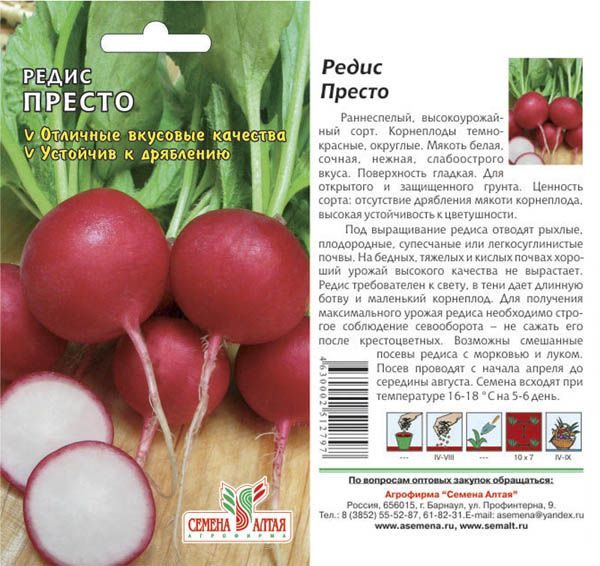 - "Campione" - periodo di maturazione di 18-25 giorni dopo l'emergenza, la radice è grande, leggermente ovale, resistente al tiratore e alle principali malattie del rafano.