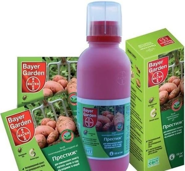 - prestigio - 10 ml del farmaco vengono diluiti in un secchio d'acqua.Lo strumento dovrebbe essere letti letti per piantare patate e altre verdure. Lasciando cadere i fiori, devono essere annaffiati. La sostanza chimica è completamente dissolta nel terreno in cinquanta giorni, non rappresenta un pericolo per la salute;
