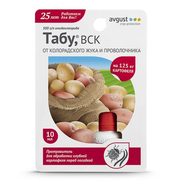 - tabù - raccomandato per la lavorazione di tuberi di patata, viene utilizzato solo durante la semina. Un mezzo conveniente, 10 ml del farmaco sono necessari per mezzo litro di acqua.