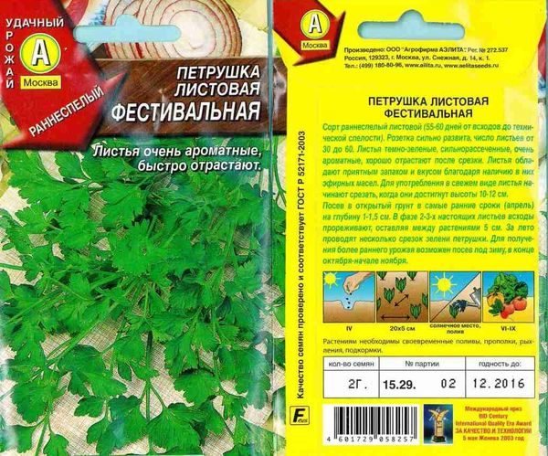 - «festival"- prezzemolo fogliare. Periodo di maturazione 56-65 giorni. Le foglie hanno un colore verde scuro, fragrante, fortemente sezionato. Dopo averlo tagliato cresce bene.