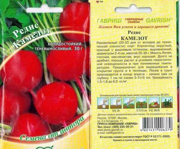 - Camelot può essere piantato sia in pieno campo che in serra. La stagione di crescita in media è di circa 23 giorni. La carne è densa e oleosa. Ha un colore bianco.Se i ravanelli sono correttamente conservati, conserveranno il loro sapore per lungo tempo;