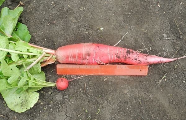 - Il Red Giant è un ortaggio tardivo. È speciale per le sue radici può essere conservato in un luogo fresco per diversi mesi. Tale coltura matura in 30-50 giorni. Il nome della varietà era dovuto alla dimensione del ravanello. La massa di un tale vegetale può raggiungere 0,3 kg;