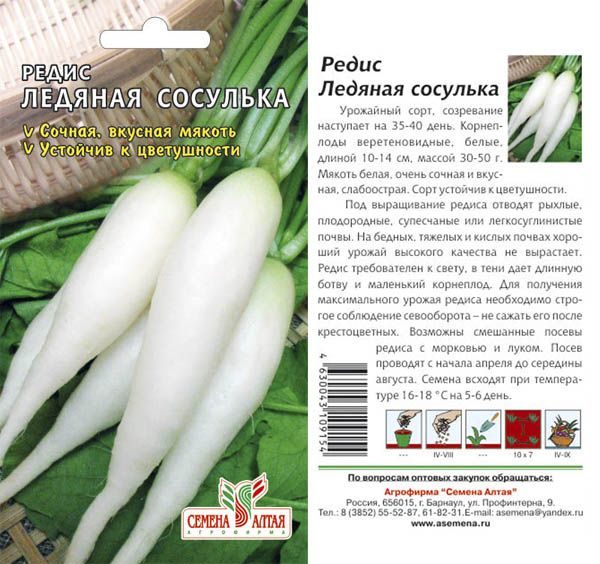- Ghiacciolo si distingue tra le altre varietà in apparenza. Radice bianca, leggermente appuntita sul fondo a forma di cono. Nella sua lunghezza raggiunge quasi i 20 cm, è gradevole al gusto, croccante e succoso, ha un gioco leggero e un amaro piuttosto debole. La raccolta di questa varietà può essere raccolta dopo 25 giorni, mentre la presentazione del vegetale arriverà dopo 40 giorni;