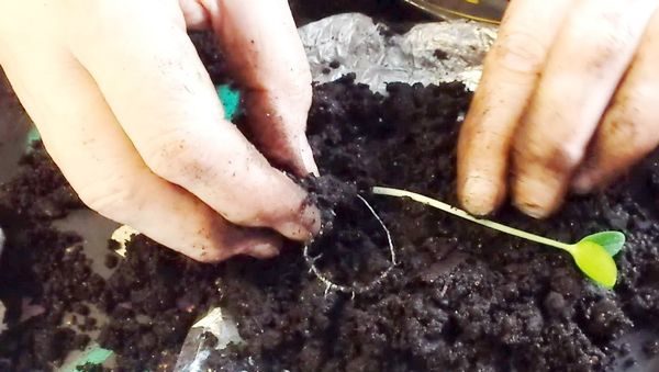 - Vous pouvez utiliser la méthode de repiquage pour de plus grandes tasses.Afin de ne pas blesser la racine, vous pouvez augmenter les gobelets existants avec des bandes de carton. Les creux remplissent le sol au niveau des premières feuilles.