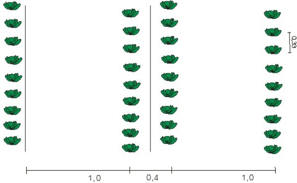 - O esquema de plantio de linhas emparelhadas repolho