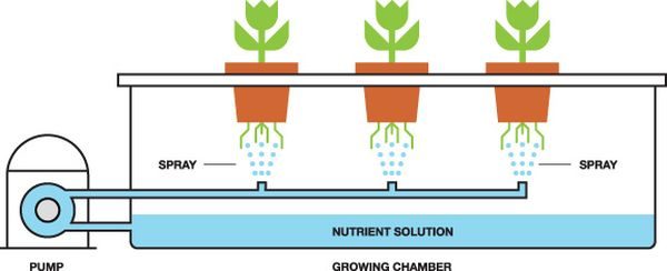 - sistema aeroponico. É considerado o mais avançado tecnologicamente. As plantas são fixadas na tampa do tanque em que os pulverizadores são inseridos, começando a trabalhar na ação da bomba e do temporizador. Depois de um certo tempo, as raízes são irrigadas com composição nutritiva enriquecida com oxigênio.