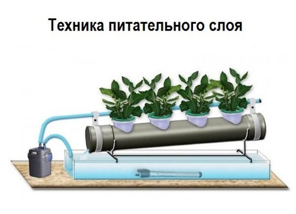 - camada nutriente. Na caixa, que registrou a cultura, a bomba é bombeada do tanque. Ele flui pelo sistema radicular e entra novamente no reservatório. O fluxo é constante, liga automaticamente.Raízes recebem oxigênio devido ao ar úmido localizado acima da superfície do fluido nutriente;