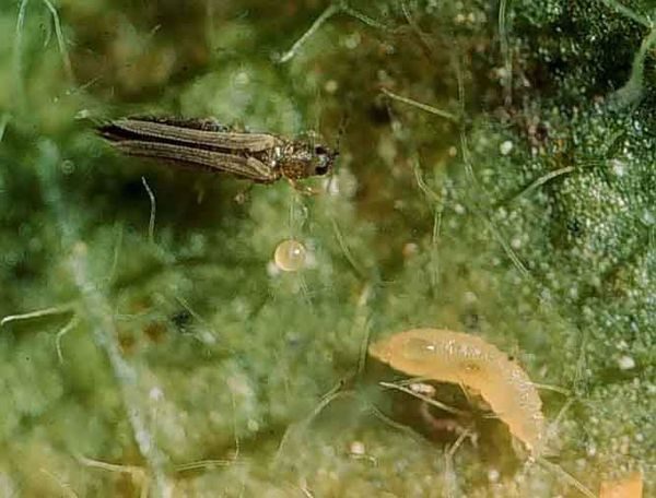 Inseto microscópico (aproximadamente 1 mm), semelhante em aparência a uma borboleta. Alimenta-se de seiva de plantas, interrompendo o movimento de nutrientes através dos vasos. Como resultado da invasão de parasitas, a cultura é primeiramente coberta com pequenas manchas prateadas, que então crescem e se fundem umas com as outras.