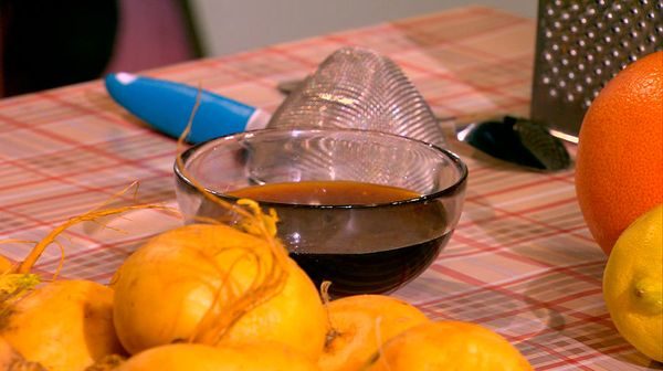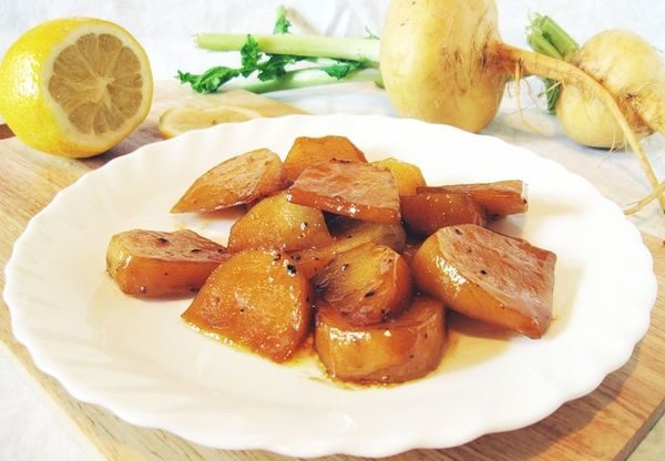 Sobremesa Na panela, pré-aqueça o açúcar com uma pequena quantidade de água (3 para 1), depois que a massa engrossar, é completamente mergulhado em fatias da cultura da raiz amarrada em espetos. Em seguida, nabos caramelizados polvilhados com açúcar em pó e servidos à mesa.