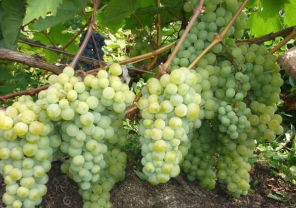 - Branco Esta espécie é uma variedade precoce de uva de alto rendimento. A duração de sua estação de crescimento é de 115 dias. De agosto até os últimos dias de setembro, você pode desfrutar ativamente da colheita de safras maduras. Frutas redondas com uma pele densa de cor branca ou verde clara com a presença de cera e dourado bronzeado. O sabor saturado é distinguido pela harmonia e doçura especial.O teor de açúcar atinge 25%, acidez até 9 g / l.