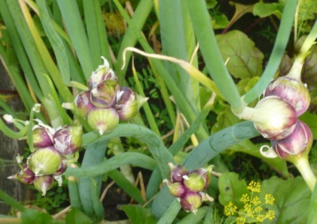 Este de remarcat faptul că pe primul nivel de bulbi sunt cele mai mari, cu un diametru de până la 3 cm, cântărind până la 25 de grame. Cu cât este mai mare nivelul, cu atât sunt mai mici becurile. Inflorescența poate avea între 3 și 30 capete. Fructe sunt crocante, ascutite, cu piele densa.