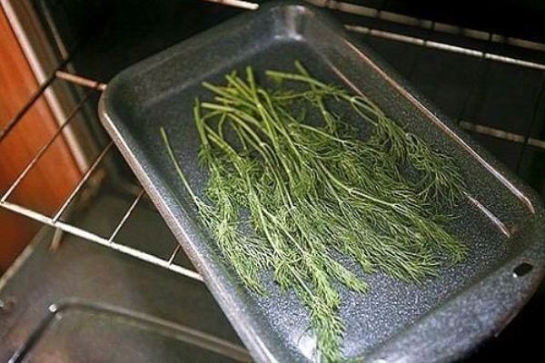 - unele gospodine decid să accelereze procesul de uscare. Pentru asta, ei mărarul se întinde pe o foaie de copt și se tratează termic în cuptor. Dar această metodă are dezavantajele sale. Având în vedere faptul că regimul de temperatură este ridicat, vârful frunzelor începe să devină galben și se îndoaie. Ca urmare, condimentele nu vor fi la fel de frumoase ca în primele două cazuri.